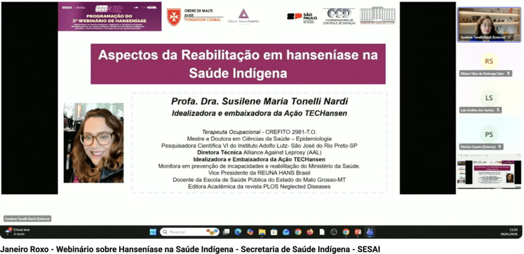 O Instituto Aliança Contra a Hanseníase (AAL) participou, no dia 30 de janeiro de 2026, do 3º Webinário de Hanseníase na Saúde Indígena, promovido pela Secretaria de Saúde Indígena (SESAI), do Ministério da Saúde. O evento reuniu especialistas, gestores públicos e profissionais de saúde para debater estratégias de vigilância, diagnóstico precoce e cuidado integral nos territórios indígenas.