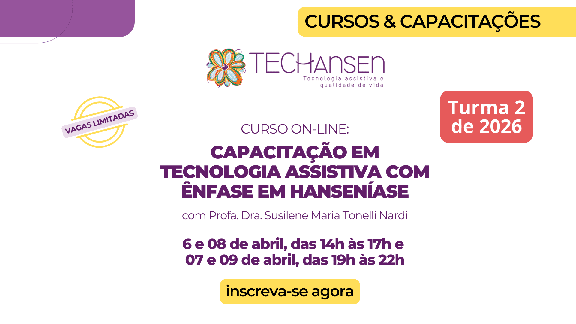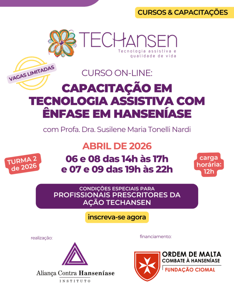 A formação será oferecida na modalidade on-line e ao vivo, com carga horária total de 12 horas, e tem como objetivo qualificar os profissionais para o uso adequado da tecnologia assistiva como ferramenta fundamental na prevenção de incapacidades, reabilitação funcional e promoção da autonomia das pessoas com hanseníase.