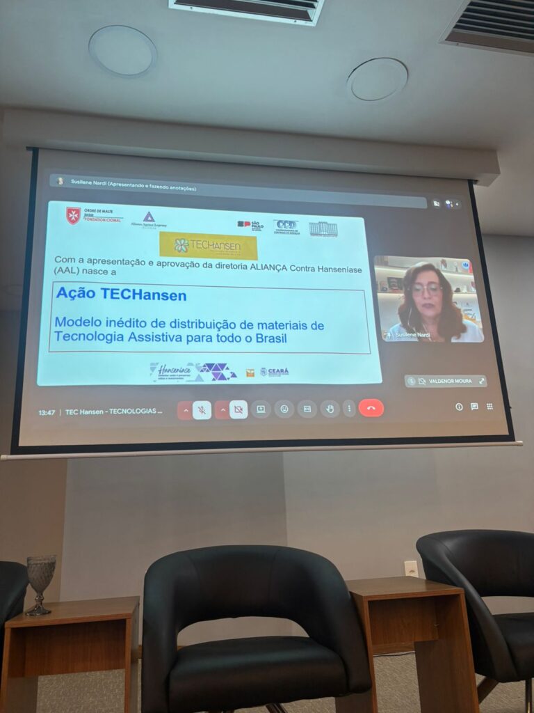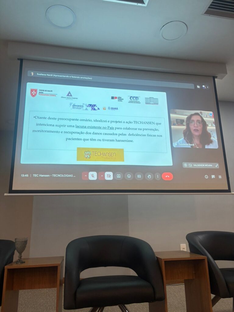 Durante o seminário, a Dra. Susilene Maria Tonelli Nardi, diretora técnica do Instituto AAL, ministra a palestra “TECHansen – tecnologias aplicadas à prevenção de incapacidades”, apresentando a iniciativa que idealizou e que utiliza recursos tecnológicos como ferramenta estratégica para promover o autocuidado, a prevenção de incapacidades, reabilitação e o cuidado longitudinal de pessoas acometidas pela hanseníase.