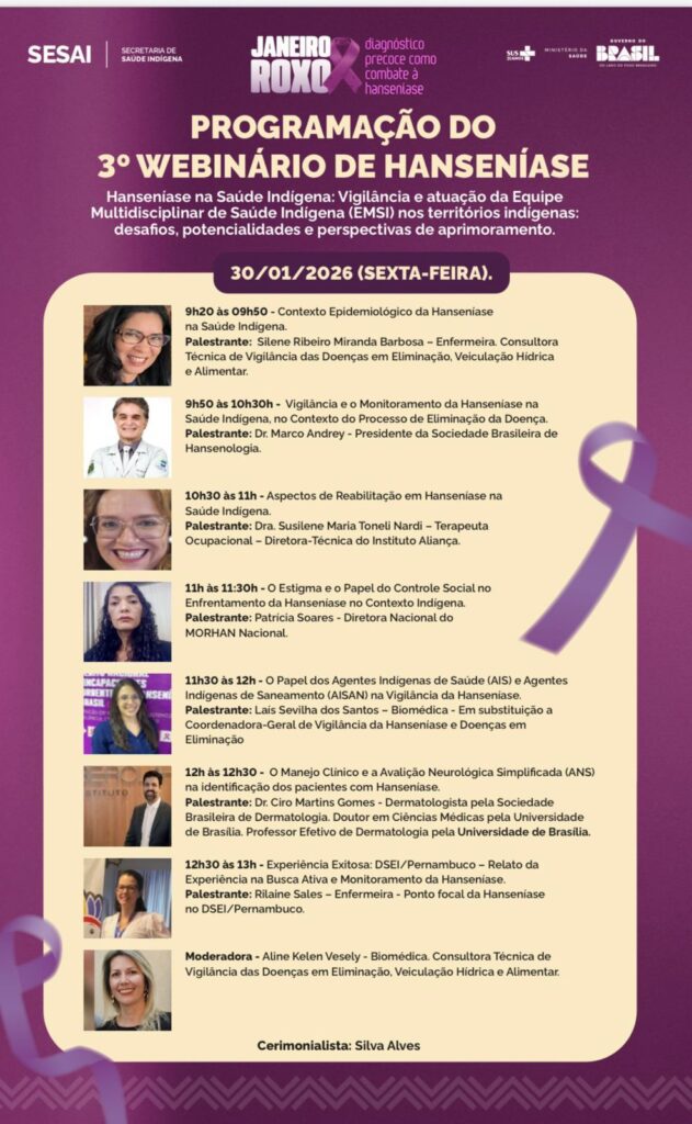 O Seminário Janeiro Roxo 2026 reúne gestores públicos, profissionais de saúde, pesquisadores e representantes de organizações da sociedade civil para discutir temas centrais como vigilância em hanseníase, diagnóstico precoce, prevenção de incapacidades, manejo das reações hansênicas e experiências exitosas no cuidado às pessoas afetadas pela doença.